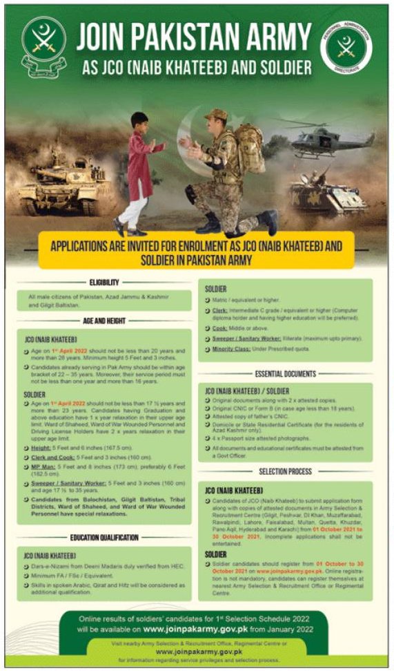 - Candidates can Join Pakistan Army Jobs 2021 as Junior Commissioned Officer (Naib Khateeb), Military Police, Sipahi (Soldier) (General Duty), Sipahi Clerk, Sipahi Cook, and Sweeper/Sanitary Worker. These vacancies are opening for Pakistani, AJK & Gilgit Baltistan nationals.